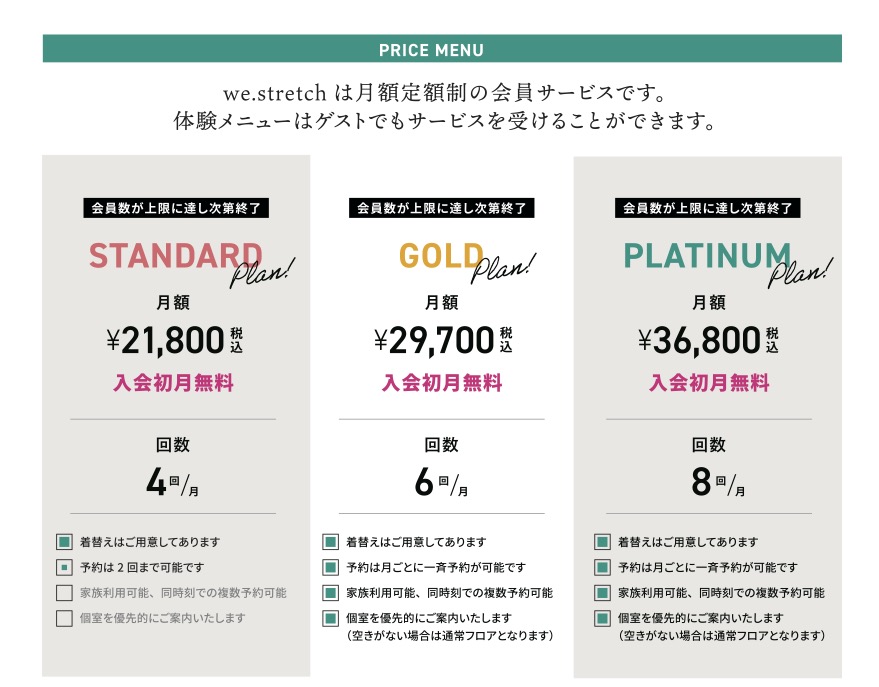 | プラチナ会員 | 月額36,800円(税込) 初月無料キャンペーン実施中! 実質8回無料! | 【マンツーマンストレッチ 45分】 or 【パーソナルトレーニング 45分】 ×月8回 | ※着替えはご用意してあります ※予約は月ごとに一斉予約が可能 ※トレーナーの指名が可能 ※家族利用、同時刻での複数予約可能 |