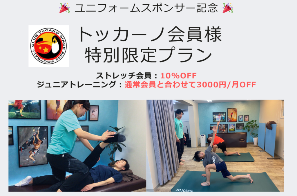we.ストレッチ&トレーニングは、トッカーノのユニフォームスポンサーとして、選手・ご家族の皆さまの身体づくりをサポートします。